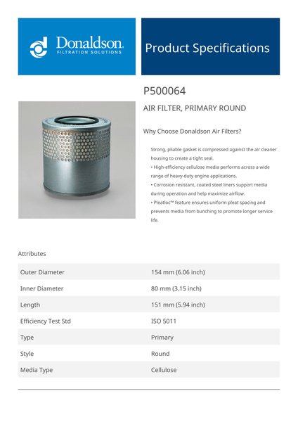 Donaldson P500064 Air Filter, Primary Round | Replaces the Maxfil EFPA689