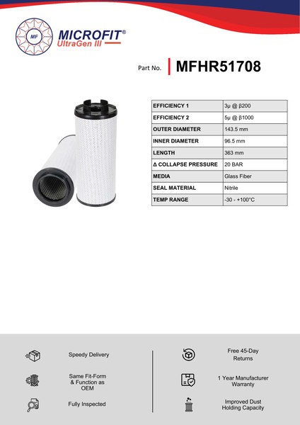 The efficiency of the element is shown using the Micron (µ) and Beta (β) ratings. The micron rating indicates the size of the particle being filtered and the beta rating the efficiency, calculated as 1/β.