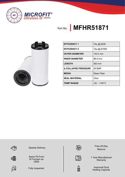 Genuine MICROFIT® UltraGen III MFHR51871. Engineered and manufactured in Great Britain the MFHR51871 is designed to meet or exceed the quality and performance of OEM quality standards, ensuring superior filtration performance and the longest possible filter life.Building on over 50 years of filtration expertise, the UltraGen III series is the third generation of MICROFIT® filter media, delivering exceptional efficiency and reliability.