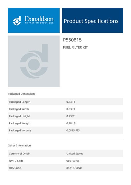 Genuine Donaldson P550815 Fuel Filter Kit is designed to provide reliable performance in fuel filter kit applications. Built with high-quality materials, it ensures consistent functionality and durability.